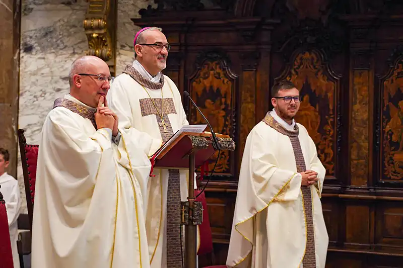 Una coincidenza fortunata fa sì che a presiedere l’Eucarestia sia mons. Pierbattista Pizzaballa, prossimo al Cardinalato, che proprio in questi giorni si trova a Bergamo. È il parroco don Giuseppe a sottolineare con tono scherzoso che “non si è mai visto che una messa di ingresso di due curati sia presieduta da un cardinale”: l’assemblea ride divertita. Sua Beatitudine Pierbattista Pizzaballa nel breve pensiero, che formula dopo il Vangelo, ci tiene a sottolineare wwche la festa non è dedicata a lui: avremo modo prossimamente di festeggiare il suo Cardinalato, ma oggi l’attenzione è tutta per don Lorenzo e don Mario.